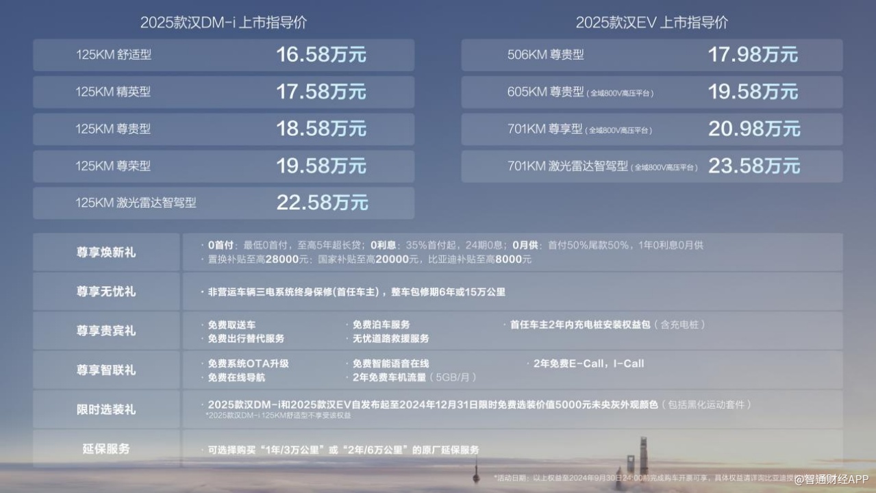 其中,2025款汉EV共推出4款车型,售价17.98万~23.58万元;2025款汉DM-i共推出5款车型,售价16.58万~22.58万元。同时,比亚迪为用户准备了包括“尊享焕新礼、尊享无忧礼、尊享贵宾礼、尊享智联礼、限时选装礼、延保服务”六重购车礼遇。值得一提的是,2024年12月31日前,购车可限时免费选装未央灰车色与黑化运动套件,总价值5000元。