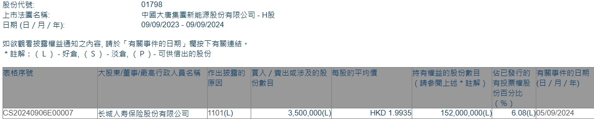 智通财经APP获悉,香港联交所最新资料显示,9月5日,长城人寿保险增持大唐新能源(01798)350万股,每股作价1.9935港元,总金额约为697.73万港元。增持后最新持股数目为1.52亿股,最新持股比例为6.08%。