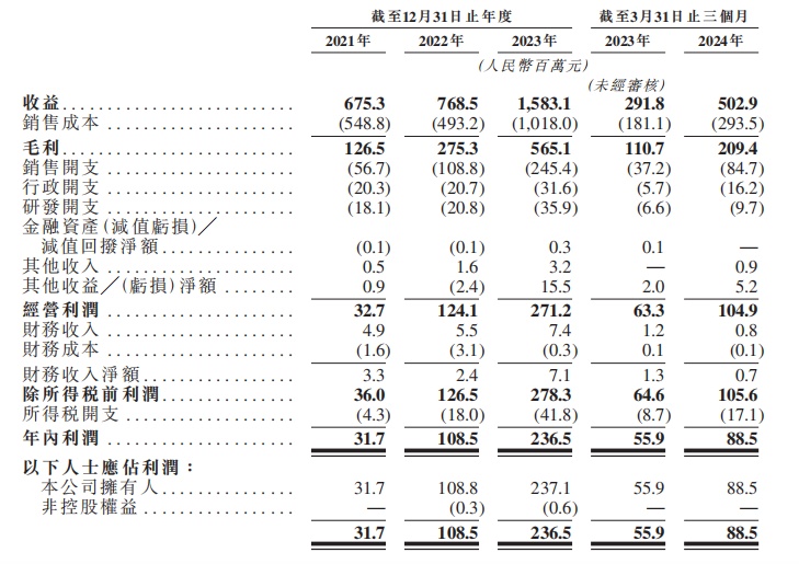 得益于全球线上渠道的扩张,公司的业绩水涨船高。2021年至2024年前3个月(以下简称:报告期内),卡罗特的营业收入分别为6.75亿元(单位:人民币,下同)、7.69亿元、15.83亿元及5.03亿元,年复合增长率为53.11%;相应的净利润分别为0.32亿元、1.09亿元、2.37亿元及0.89亿元,年复合增长率为173.14%。营收及净利润双双高增,可见卡罗特的高增长态势。