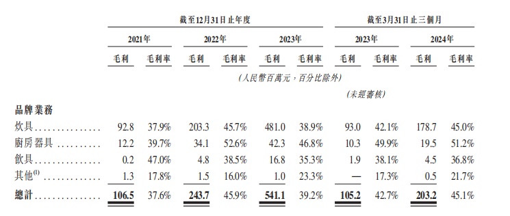 分业务来看,公司大部分收益来自销售自有品牌的厨具产品,该等产品为其整体经营业绩作出重大贡献。2021年占2023年,公司品牌业务收益分别为2.83亿元、5.31亿元及13.80亿元,占总收益的41.9%、69.1%及87.2%;ODM业务收益分别为3.92亿元、2.38亿元及2.03亿元,占总收益的58.1%、30.9%及12.8%。简言之,无论是业务规模还是营收占比,品牌业务均成为卡罗特的第一大业务。