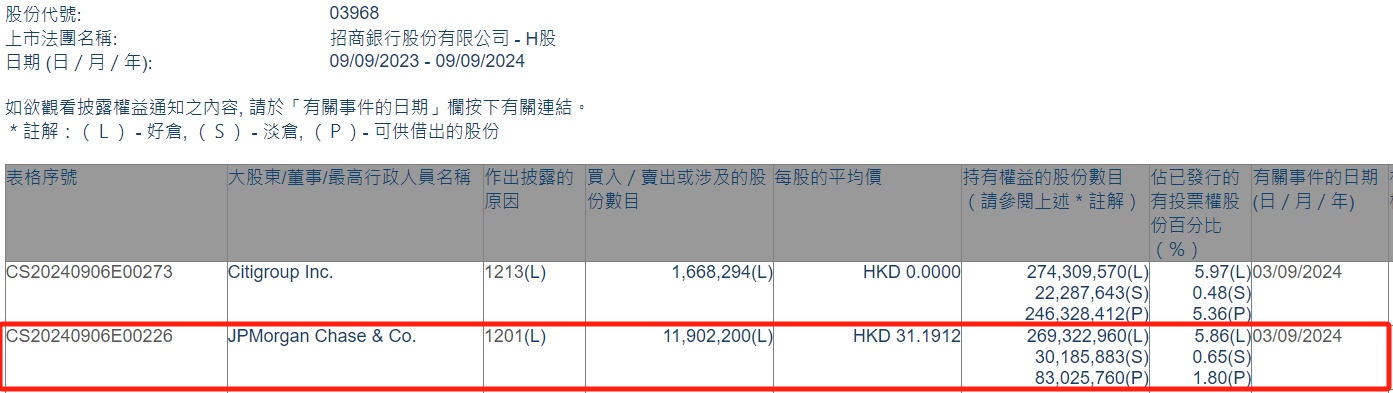 智通财经APP获悉,据香港联交所最新数据显示,9月3日,小摩减持招商银行(03968)1190.22万股,每股作价31.1912港元,总金额约为3.71亿港元。减持后最新持股数目约为2.69亿股,持股比例为5.86%。