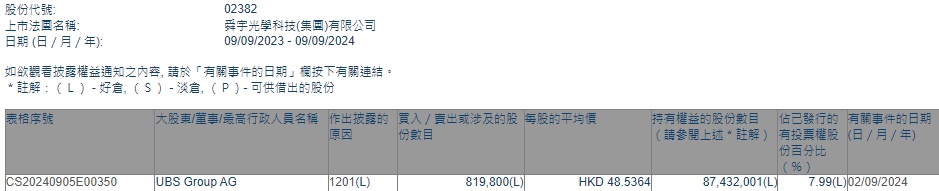 智通财经APP获悉,香港联交所最新资料显示,9月2日,瑞银减持舜宇光学科技(02382)81.98万股,每股作价48.5364港元,总金额约为3979.01万港元。减持后最新持股数目约为8743.20万股,最新持股比例为7.99%。