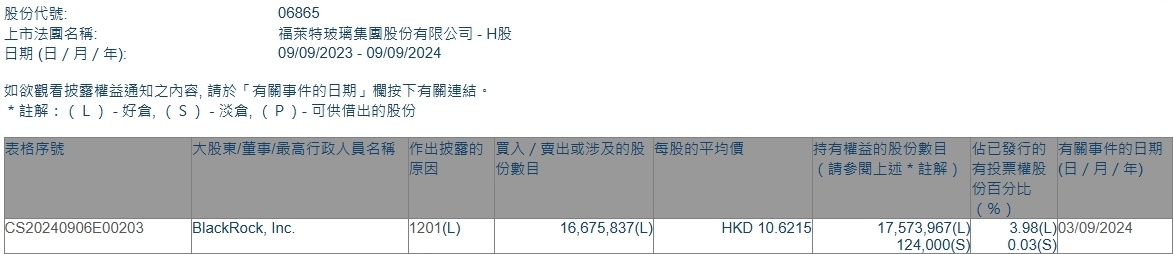 智通财经APP获悉,香港联交所最新资料显示,9月3日,贝莱德减持福莱特玻璃(06865)1667.5837万股,每股作价10.6215港元,总金额约为1.77亿港元。减持后最新持股数目约为1757.4万股,最新持股比例为3.98%。