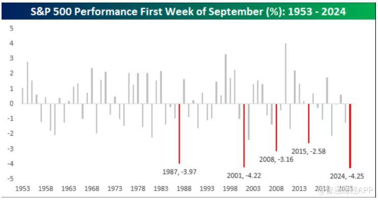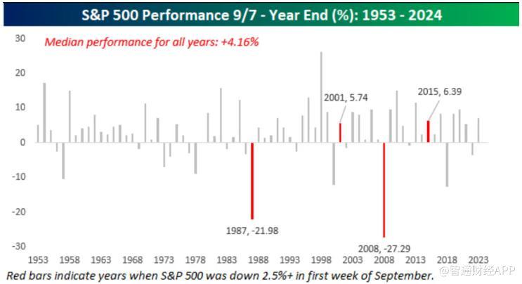 该公司进一步指出:“历史上,标普500指数在九月首周下跌超过2.5%的情况只有四次发生。”此前,九月开局最糟糕的记录是在2001年,而其他几次则分别发生在1987年、2008年和2015年。