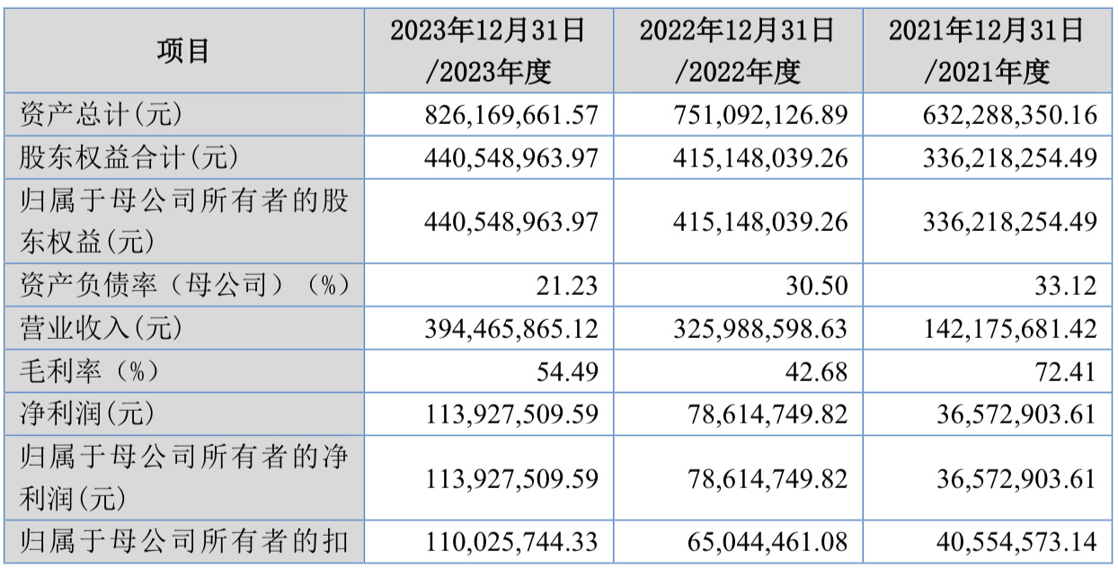 财务方面,于2021年度、2022年度及2023年度,公司实现营业收入分别约为1.42亿元、3.26亿元、3.94亿元。公司净利润分别约为3657.29万元、7861.47万元、1.14亿元人民币。