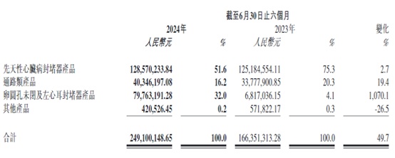 受益于产品商业化的持续落地,截至2024上半年,集团一半以上的收入均来自于销售先天性心脏病封堵器产品。进一步来看,先天性心脏病封堵器产品的销售收入由上年同期的1.25亿元增加2.7%至1.29亿元,占集团同期收入的51.6%。此外,卵圆孔未闭及左心耳封堵器产品的收入占比提升至32%。