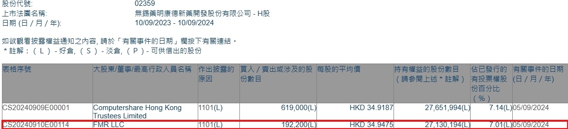 智通财经APP获悉,香港联交所最新资料显示,9月5日,FMR LLC增持药明康德(02359)19.22万股,每股作价为34.9475港元,总金额约为671.69万港元。增持后最新持股数目约为2713.02万股,持股比例为7.01%。
