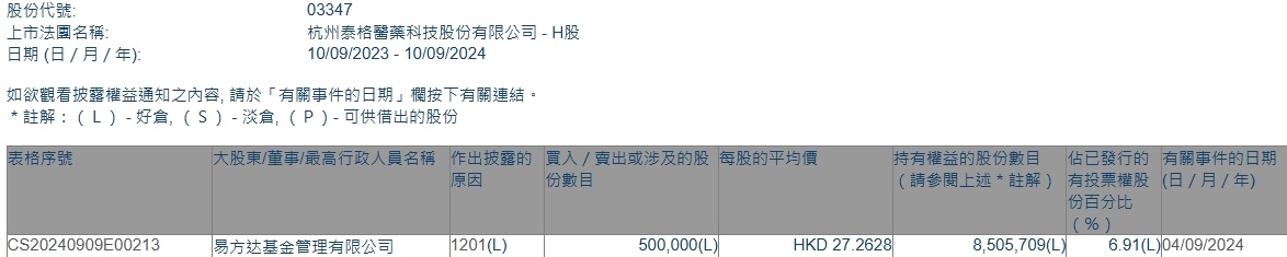 智通财经APP获悉,香港联交所最新资料显示,9月4日,易方达基金减持泰格医药(03347)50万股,每股作价27.2628港元,总金额为1363.14万港元。减持后最新持股数目约为850.57万股,持股比例为6.91%。