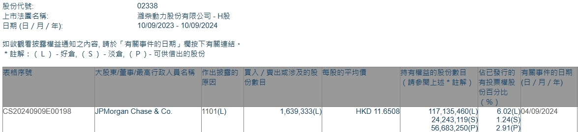 智通财经APP获悉,香港联交所最新资料显示,9月4日,摩根大通增持潍柴动力(02338)163.9333万股,每股作价11.6508港元,总金额约为1909.95万港元。增持后最新持股数目约为1.17亿股,最新持股比例为6.02%。