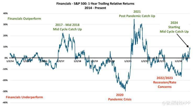 尽管金融股在过去一年中表现良好,与之前的经济中期周期相比,其8.4个百分点的超额收益“仍显逊色”。例如,2017年至2018年期间,金融股的超额收益高达20个百分点。