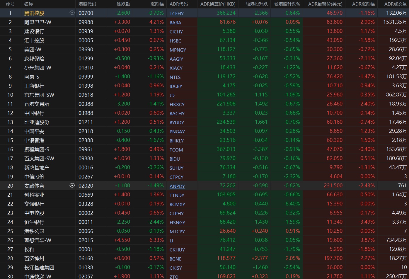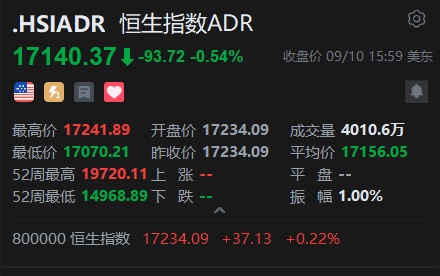 智通财经APP获悉,周二美股三大指数涨跌不一,恒生指数ADR下跌,按比例计算,收报17140.37点,较香港收市下跌93.72点或0.54%。