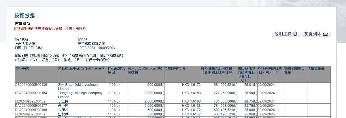 智通财经APP获悉,香港联交所最新资料显示,9月9日,天工国际(00826)董事会主席朱小坤通过其名下公司Tiangong Holdings Company Limited、CEO朱泽峰通过其名下公司Sky Greenfield Investment Limited分别增持公司200万股和50万股,总金额分别为323.76万港元、80.86万港元。增持后朱小坤及朱泽峰最新持股数目分别约为7.84亿股、6.83亿股,最新持股比例分别为28.75%、25.06%。