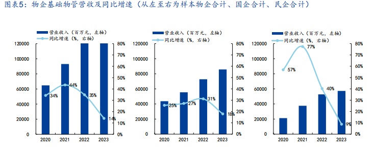 以2023年国盛证券抽取18家物企作为样本,其基础物管收入(包括商业运营)共1431亿元,同比增长14%,增幅较2022年收窄21个百分点;非业主增值服务收入总计154亿元,同比降低16%,降幅扩大9个百分点。
