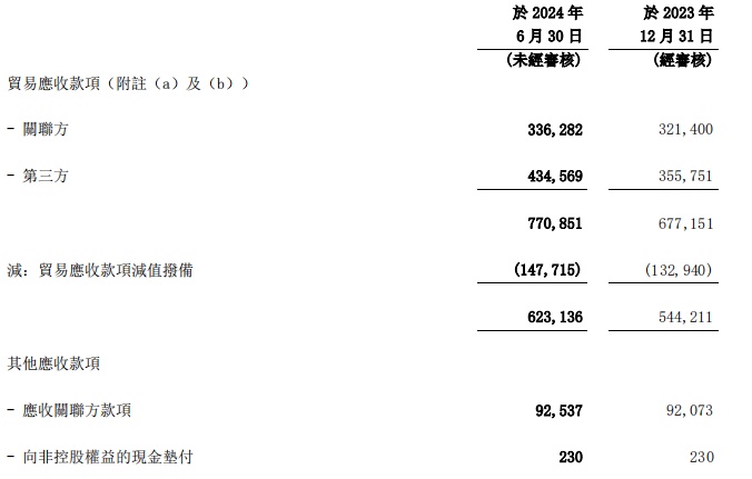 比如,其贸易应收款项的大额增加导致信用减值损失金额提高。2023年度,该集团的信用减值损失为约8864.8万元,较2022年同期增长85.7%,主要增长原因是受整体房地产市场下行的影响,导致关联方贸易及其他应收款项回款速度降低,且提高了房地产行业的预期信用损失率,导致本年度关联方应收款项预期信用损失准备金额较2022年增长较多。