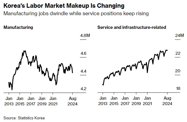 深入研究最新的就业报告会发现,多年来,制造业在创造就业方面的表现一直低于服务业。制造业是该国出口导向型经济的核心引擎,而且总体薪酬高于服务业,而服务业多年来一直在创造就业机会,这凸显了劳动力市场的长期重组。
