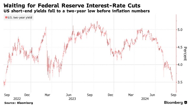 两年期美债收益率一度下跌5个基点,至3.55%,为2022年9月以来的最低水平。定于周三晚些时候发布的通胀报告预计将显示,美国8月份CPI同比上涨2.5%,低于7月份的2.9%。