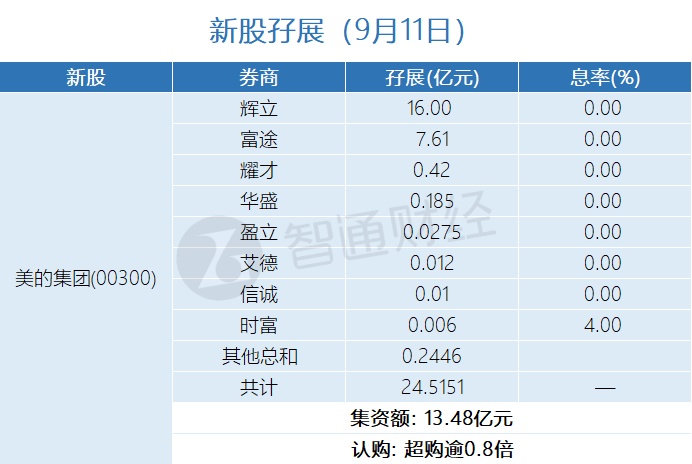 智通财经APP获悉,美的集团(00300)正在招股中。截止9月11日,辉立、华盛等券商合计为美的集团借出24.5151亿港元,超购逾0.8倍。