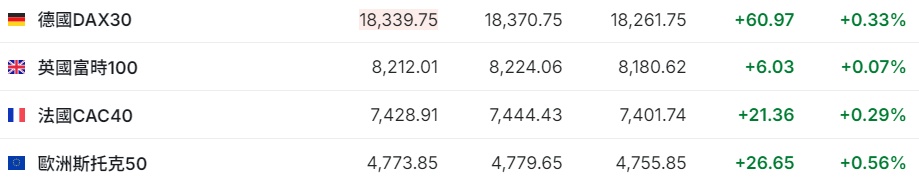 2. 截至发稿,德国DAX指数涨0.33%,英国富时100指数涨0.07%,法国CAC40指数涨0.29%,欧洲斯托克50指数涨0.56%。