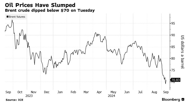 全球基准布伦特原油价格周二跌破每桶 70 美元,为 2021 年 12 月以来首次,不过周三价格又回升至该水平之上。