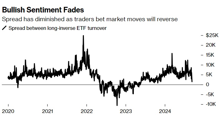 彭博Athanasios Psarofagis汇编的数据显示,相对于多头ETF,杠杆型反向ETF的日交易量正在上升,这是另一个避险情绪升温的迹象。价差仍然偏向于做多,但差距是去年以来最小的。这些利用衍生品提高回报的高强度反向ETF,已成为交易员表达观点的流行方式。