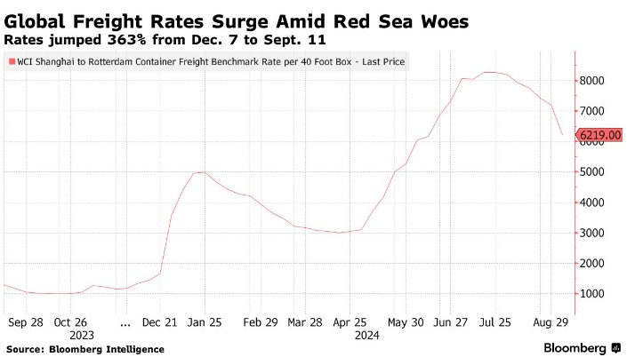彭博分析师Lee A . Klaskow和Kenneth Loh表示:“集装箱班轮业及其连接的供应链再次受到打击,这次是受到红海旷日持久的危机的打击。近期的结果是集装箱运价和班轮公司收益飙升。”