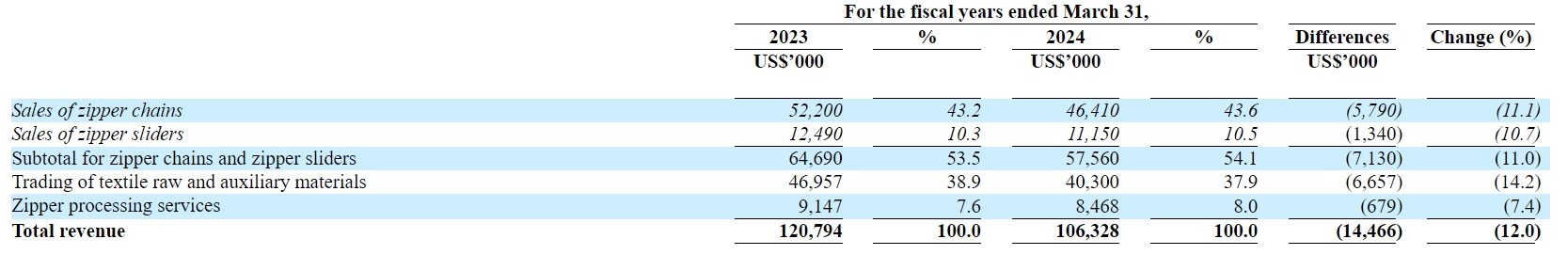 从业务类型上看,福兴集团主要有三大收入来源,分别是拉链产品、纺织原辅材料贸易、拉链加工服务。2024财年(截至3月31日止12个月)时,福兴集团来自上述三大业务的收入占比分别为54.1%、37.9%、8%。
