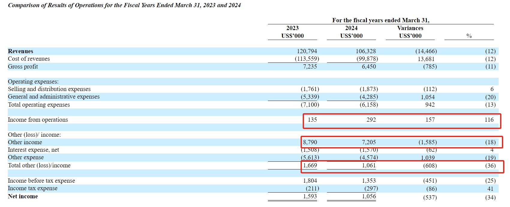 从业绩来看,福兴集团2024财年的表现不佳。报告期内,其收入下滑12%至1.06亿美元,净利润下滑34%至105.6万美元,呈现出了收入、利润双降的局面。