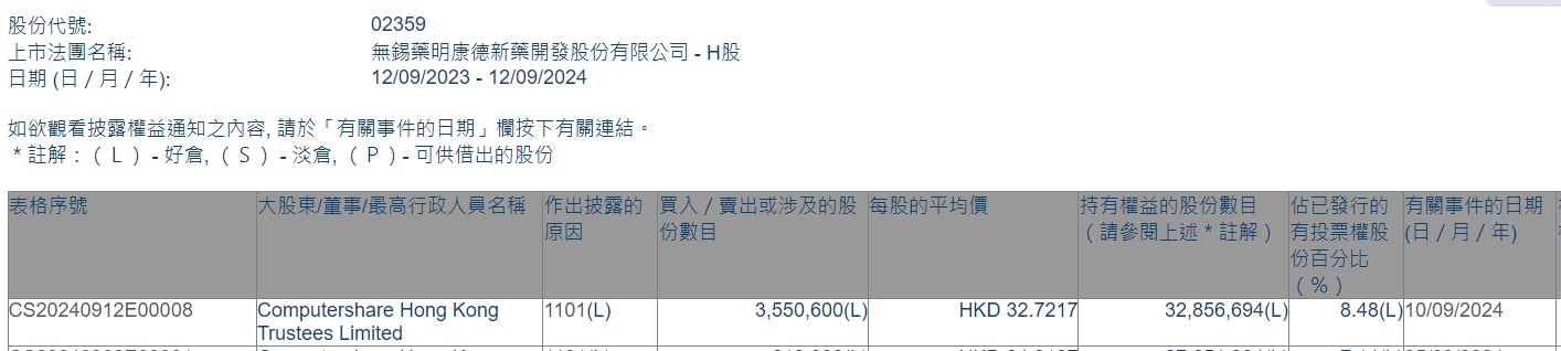 智通财经APP获悉,香港联交所最新资料显示,9月10日,Computershare Hong Kong Trustees Limited增持药明康德(02359)355.06万股,每股作价32.7217港元,总金额约为1.16亿港元。增持后最新持股数目约为3285.67万股,持股比例为8.48%。