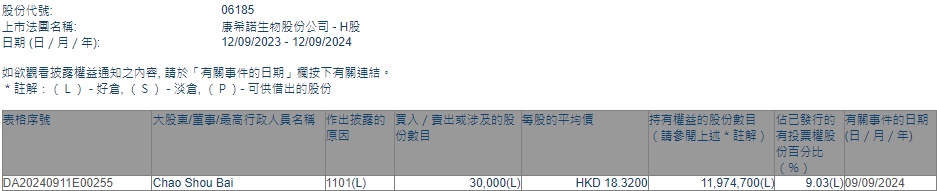 智通财经APP获悉,香港联交所最新资料显示,9月9日,执行董事巢守柏增持康希诺生物(06185)3万股,平均每股作价为18.32港元,总金额为54.96万港元。增持后最新持股数目为1197.47万股,最新持股比例为9.03%。