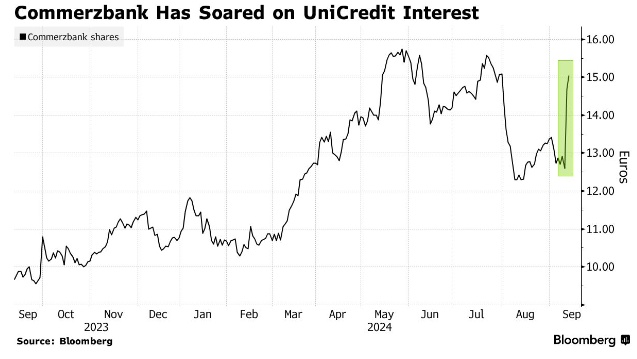 周三,在意大利联合信贷银行表示已持有该公司 9% 的股份并计划开始谈判后,德国商业银行股价飙升17%。知情人士称,这家德国银行的执行董事会正在审查其防御战略。两家银行合并后,将诞生德国最大的银行,超越德意志银行。