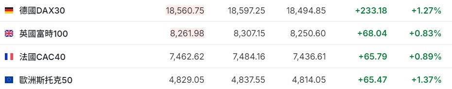 2. 截至发稿,德国DAX指数涨1.27%,英国富时100指数涨0.83%,法国CAC40指数涨0.89%,欧洲斯托克50指数涨1.37%。