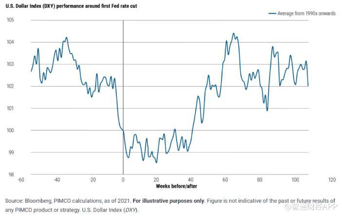 Pimco的非传统策略首席投资官Marc Seidner和投资组合经理Pramol Dhawan指出,“自20世纪90年代以来,在美联储的历次初步降息时,美元往往会至少暂时走低。”