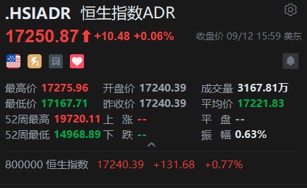 智通财经APP获悉,周四美股三大指数集体上涨,恒生指数ADR上涨,按比例计算,收报17250.87点,较香港收市上涨10.48点或0.06%。
