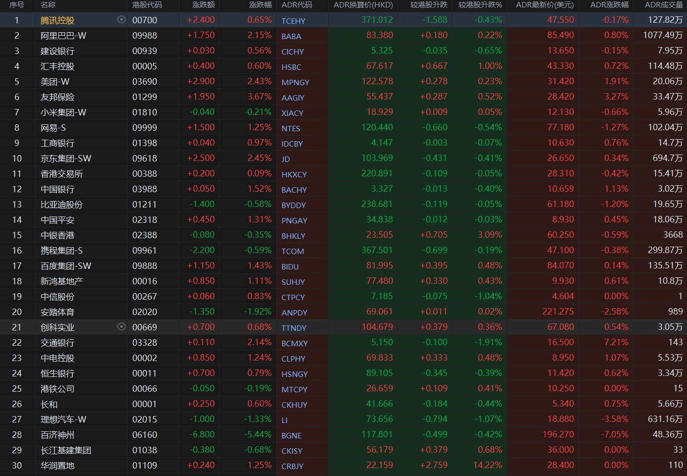 大型蓝筹股涨跌不一,汇丰控股收报67.617港元,较香港收市上涨1%;腾讯控股收报371.012港元,较香港收市下跌0.43%。