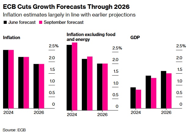 欧洲央行还略微下调了对欧元区未来三年产出的预期,这突显出经济恶化的背景。一些分析师认为,欧元区经济恶化正在抑制价格压力,并加速了欧洲央行当前季度的降息步伐。