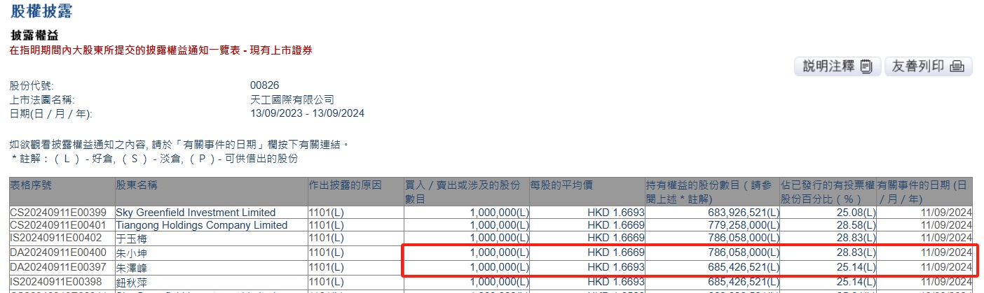 智通财经APP获悉,香港联交所最新资料显示,9月11日,天工国际(00826)董事会主席朱小坤通过其名下公司Tiangong Holdings