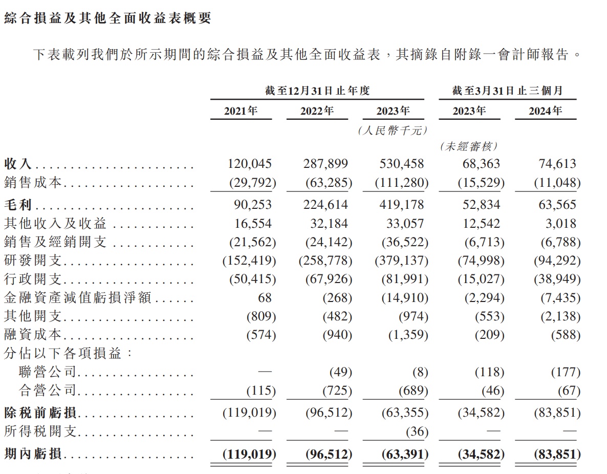 财务方面,于2021年度、2022年度、2023年度、2024年截至3月31日止三个月,公司的收入分别约为人民币1.20亿元、2.88亿元、5.30亿元、0.75亿元,同期,该公司的年内亏损分别约为人民币1.19亿元、9651.2万元、6339.1万元、8385.1万元。