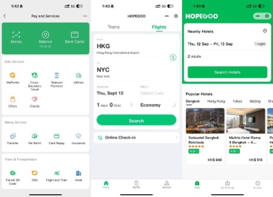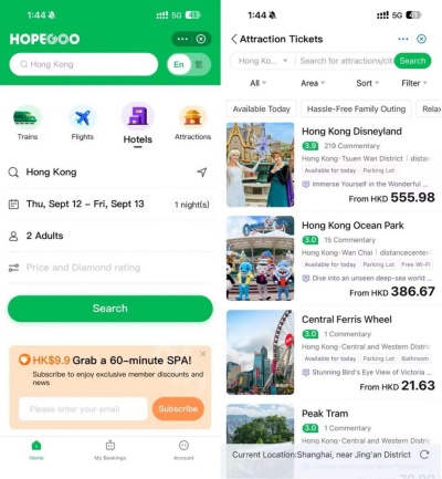 同程旅行HopeGoo相关负责人介绍,境外游客可以在WeChat HK小程序服务选项中,点击机票火车票、酒店入口,从HopeGoo小程序进行预订购买。而Alipay HK小程序除了在机酒、火车高铁票预订购买外,还增加了景点门票的预订购买,大大提高境外游客在中国旅行的便捷性。
