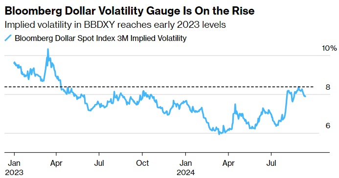 外汇经理们正在努力应对一系列令人眼花缭乱的不确定因素,这些因素可能会进一步加剧汇率的波动。在美联储下周预计准备降息、美国大选临近的情况下,一项衡量美元三个月隐含波动率的指标达到了自2023年初区域性银行业危机以来的最高水平。