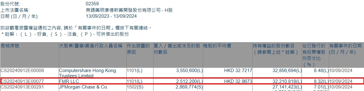 智通财经APP获悉,香港联交所最新资料显示,9月10日,FMR LLC增持药明康德(02359)251.22万股,每股作价为32.8673港元,总金额约为8256.92万港元。增持后最新持股数目约为3221.08万股,持股比例为8.32%。