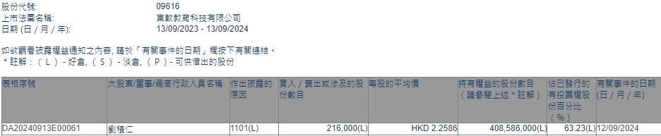 智通财经APP获悉,香港联交所最新资料显示,9月12日,董事长刘积仁增持东软教育(09616)21.6万股,平均每股作价为2.2586港元,总金额约为48.79万港元。增持后最新持股数目约为4.09亿股,最新持股比例为63.23%。