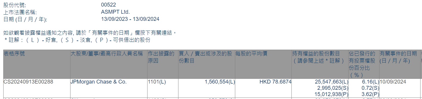 智通财经APP获悉,据香港联交所最新数据显示,9月10日,小摩增持ASMPT(00522)156.0554万股,每股作价78.6874港元,总金额约为1.23亿港元。增持后最新持股数目约为2554.77万股,持股比例为6.16%。