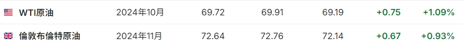 3. 截至发稿,WTI原油涨1.09%,报69.72美元/桶。布伦特原油涨0.93%,报72.64美元/桶。