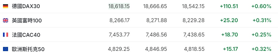 2. 截至发稿,德国DAX指数涨0.60%,英国富时100指数涨0.31%,法国CAC40指数涨0.25%,欧洲斯托克50指数涨0.32%。