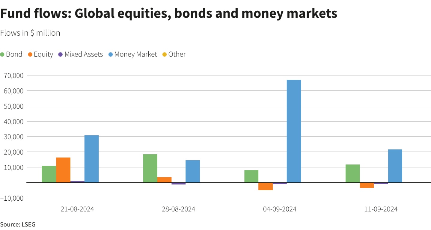 智通财经APP获悉,全球投资者在截至9月11日的一周内连续第二周净卖出股票基金,这主要是由于对美国经济健康状况的担忧以及美国总统辩论前的政治不确定性。尽管如此,市场对央行可能降息的乐观预期缓解了资金的流出速度。