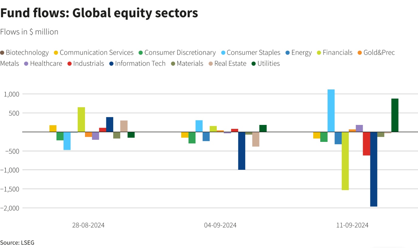 在行业方面,科技板块在截至9月11日的一周内资金流出达到19.7亿美元,为2023年11月以来的最大规模。金融股也出现了15.3亿美元的资金流出。相比之下,消费必需品和公用事业股分别吸引了11.2亿美元和8.78亿美元的资金流入。