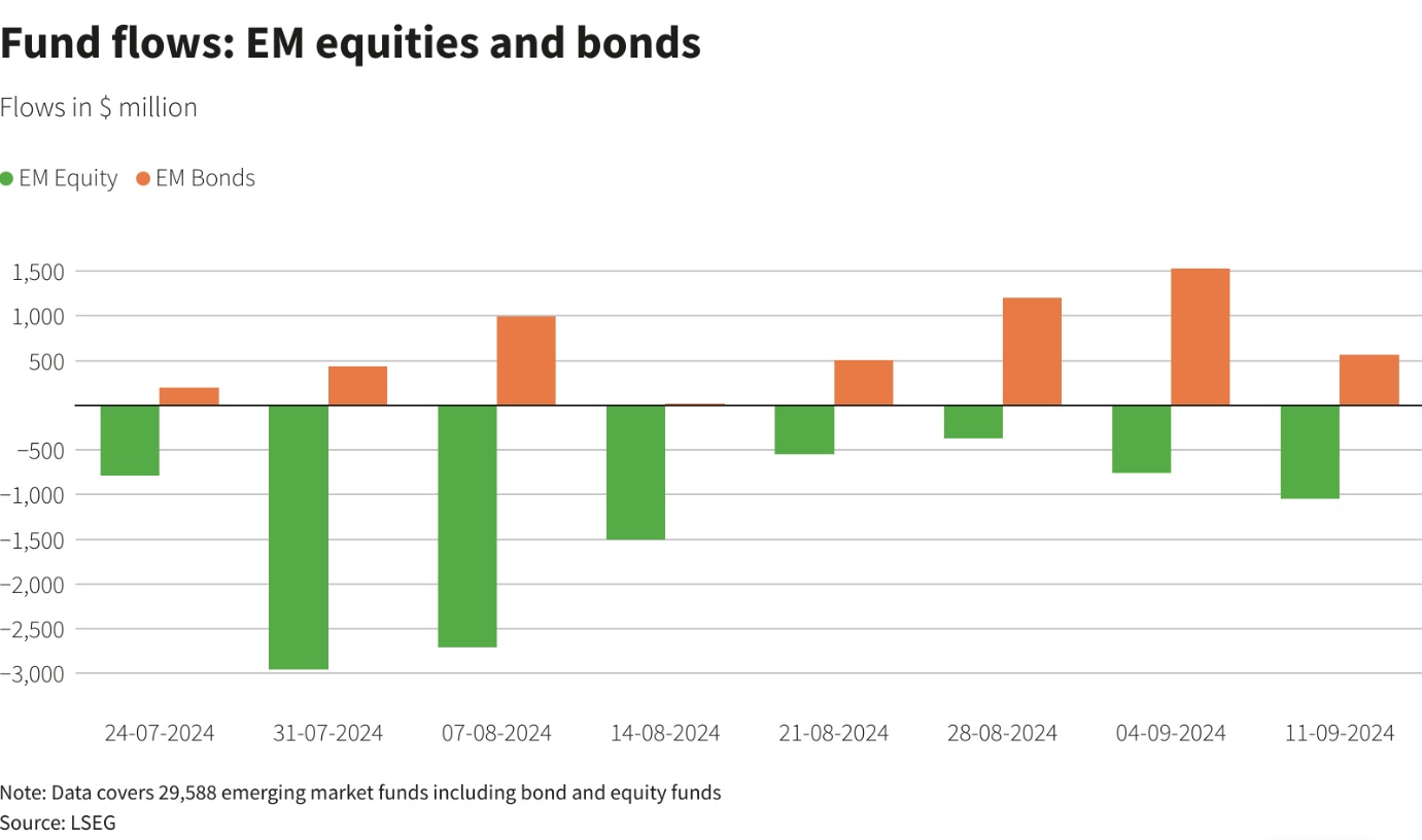 新兴市场基金数据显示,股票基金连续第14周流出资金,总额为10.5亿美元,而债券基金则连续第12周实现资金流入,总额为5.67亿美元。