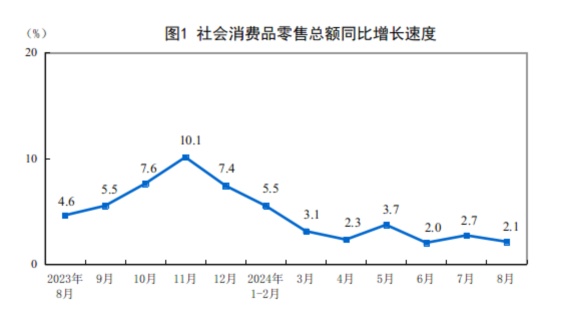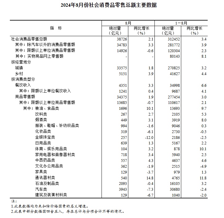 8月份,社会消费品零售总额38726亿元,同比增长2.1%。其中,除汽车以外的消费品零售额34783亿元,增长3.3%。1—8月份,社会消费品零售总额312452亿元,同比增长3.4%。其中,除汽车以外的消费品零售额281772亿元,增长3.9%。