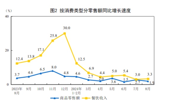 按消费类型分,8月份,商品零售额34375亿元,同比增长1.9%;餐饮收入4351亿元,增长3.3%。1—8月份,商品零售额277454亿元,增长3.0%;餐饮收入34998亿元,增长6.6%。