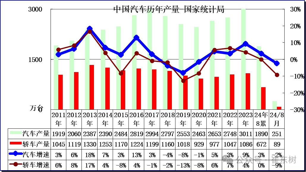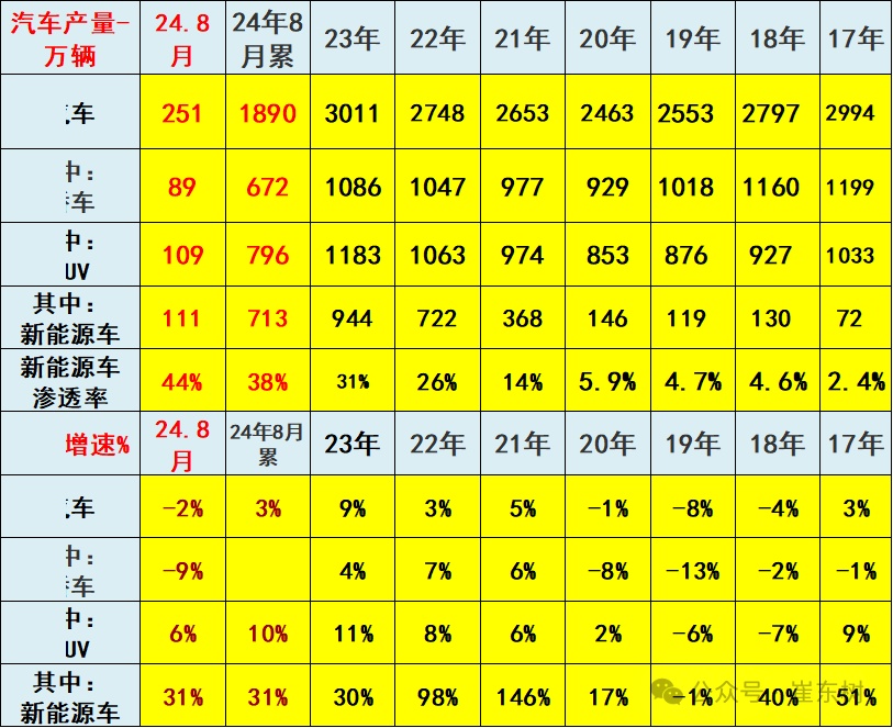 2024年8月汽车生产251万台,同比下降2%;新能源汽车生产111万台,同比增31%,渗透率44%。1-8月汽车生产1890万台,同比增长3%;新能源汽车生产713万台,同比增31%,渗透率38%,这是回归平稳的增长。